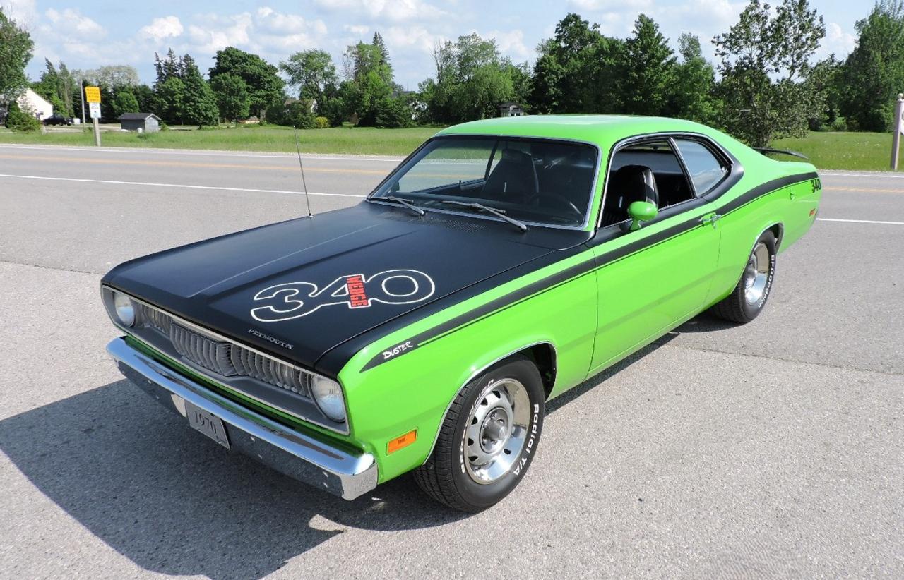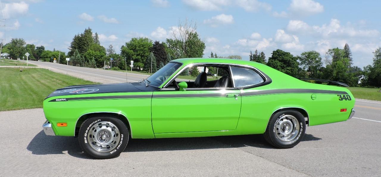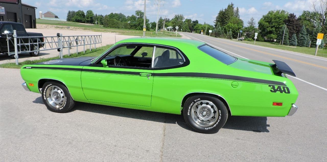 ATTN: AMERICAN BUYERS THE PRICE IS IN CANADIAN FUNDS, PLEASE CALL FOR USA DOLLAR RATES. A beautiful and fully restored 1970 Plymouth Duster 340 CI 4-speed standard transmission. This Duster underwent a very high-quality complete rotisserie restoration. The 340 engine was rebuilt using all the best parts including a Comp Cams 20-221-3 447/455 lift cam, an Edelbrock 1406 600 CFM carb with electric choke and still retains the factory intake and exhaust manifolds. The A-833 4-speed transmission was refreshed and a new clutch and pressure plate added. The 8 3/4 rear end was rebuilt with 3:55 gears, bearings and Suregrip unit, the rear axles were replaced and upgraded to large bolt pattern. This 1970 Duster is a factory H code 340 and factory 4-speed transmission that had the Sharktooth grill and hood black out treatment applied to make it look like a 1971 Duster. The FJ6 Sassy Grass Green paint is stunning and polished to perfection, the panel alignment, gaps and seams are all excellent. All the chrome and trim are either new or was polished and refinished to excellent condition. New rims and new 15-inch BFGoodrich tires, new brakes, steering and suspension parts throughout. The interior was redone with new carpet, seat covers and headliner, the dash is in excellent and fully functional condition. Brakes were upgraded to front disc with big bolt pattern, this car was optioned with manual steering and brakes and is still original. See all the pictures and watch the video then come see this beautiful, top-quality Duster in person. A 3-year powertrain warranty is included with purchase. Comes with current insurance appraisal. Trade up or down on other muscle cars/trucks or late model 4X4 trucks. Delivery or shipping can be arranged right to your door within Canada and the USA.