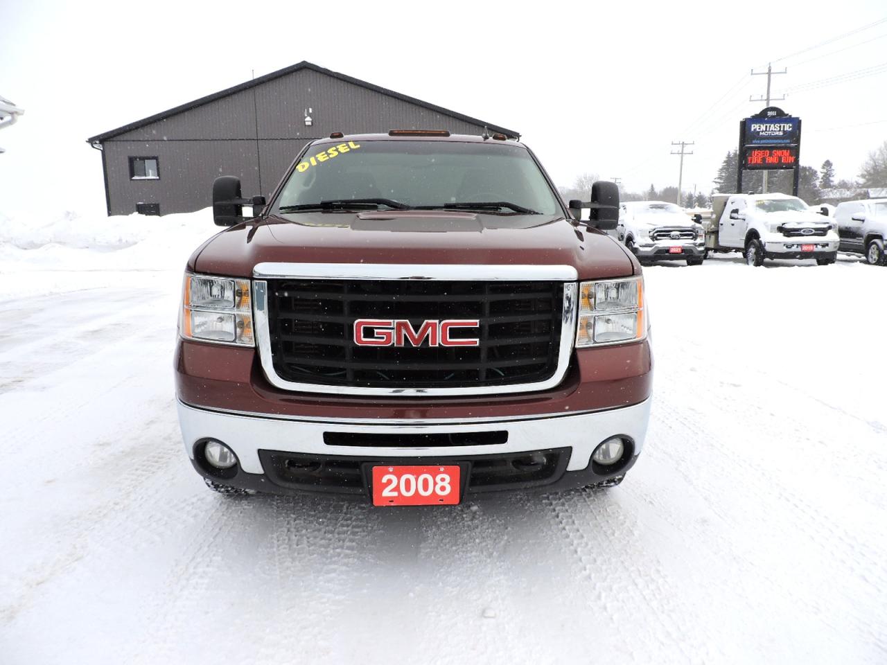 A beautiful rust-free and low mileage 2008 Sierra 2500 SLE that is powered by an awesome LMM code 365 HP/660 lb-ft torque pre-DEF Duramax turbo diesel engine. IT IS 2-WHEEL DRIVE. This truck was well oiled and minimal winter usage, see the numerous pictures showing the rust protection that was previously applied to preserve it. Full power group including keyless entry, windows, locks and mirrors. Dual climate controls, built-in electric brake controller and fog light options. Bluetooth, steering wheel mounted audio controls and a CD player. Power adjust seats on both front buckets. New tires and new front brake pads, rotors and calipers were installed for the safety. A retractable tonneau cover and 5th wheel rails along with a Hijacker 16K dual pivoting 5th wheel hitch were added to the 6 1/2-foot length box. SEE ALL THE EXTRA PICTURES OF THE RUST-FREE BODY ON THIS 2008 THEN COME SEE IT IN PERSON. This awesome 2500 Sierra is safetied, serviced and ready to drive or tow.