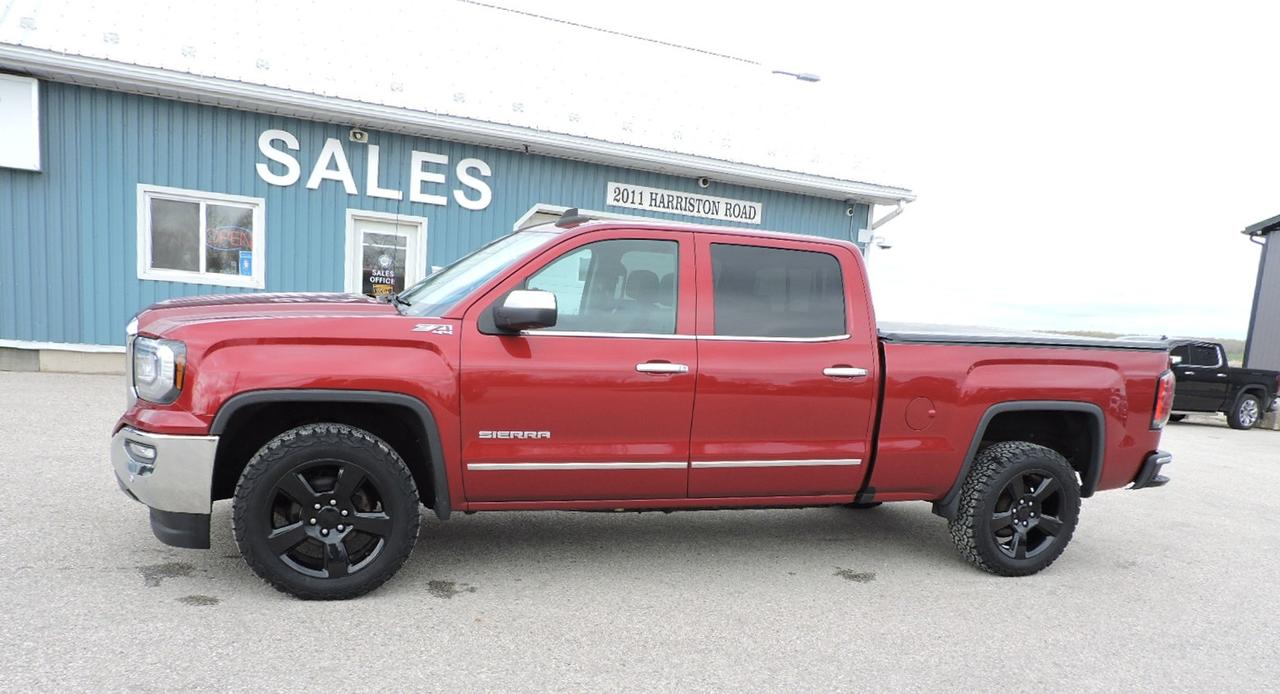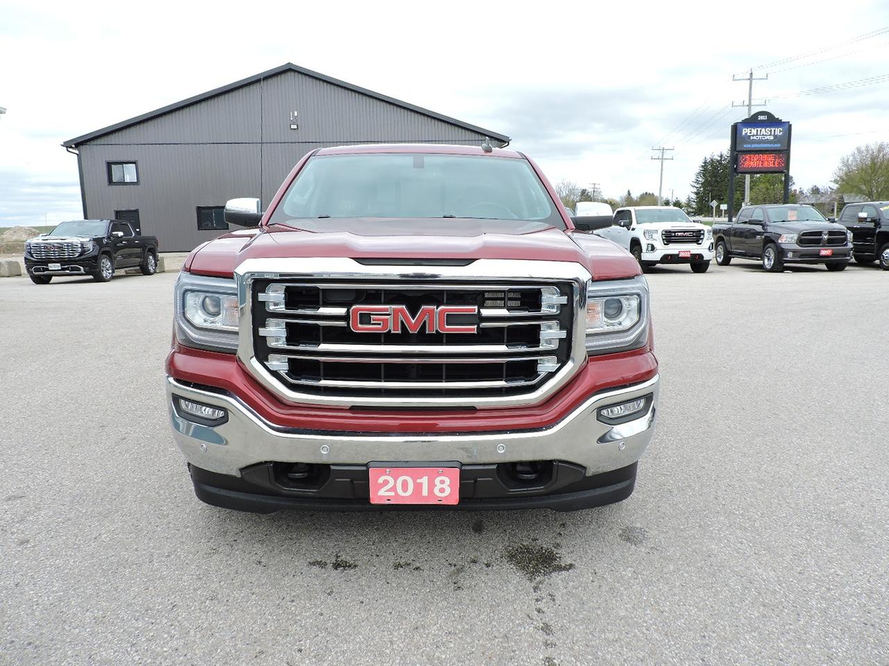 Loaded with options 2018 Sierra 1500 SLT that is powered by a 5.3L V8 engine, 6-speed transmission, 4-wheel drive and 3:42 gear ratios. Heated leather seats and heated steering wheel. Sunroof and power rear sliding window. Navigation, power adjust pedals, remote start and built-in electric brake controller options. Bluetooth, steering wheel mounted audio controls, CD player and Bose speaker system. Back-up camera along with both front and rear park assist systems. Sprayed in box liner and a tonneau cover were added to the 6 1/2-foot length box. A must-see 1500 SLT.